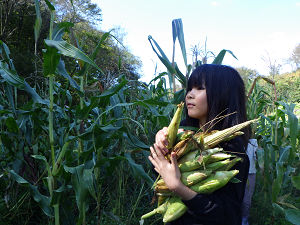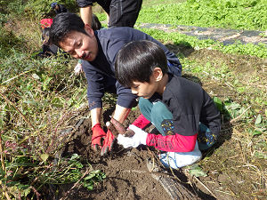 当番活動が終わった後は、みんなで「農作業体験」に取り組みました。今回、収穫したのは、サツマイモの「紅はるか」と「ポップコーン(トウモロコシの一種)」です。サツマイモの収穫では、土を掘り起こし、サツマイモを折らないように周りの土を少しずつ掘り進めて収穫しました。中には友達と協力し合って6個以上のサツマイモが繋がったまま収穫していた場面もありました。ポップコーンの収穫は茎に生えているものをもぎ取って収穫しました。