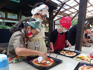 農業体験の後は、少し体験活動・自然遊びを楽しみ、みんなお待ちかねの「手作りピザ体験」です。自分たちで生地を伸ばして成型し、トッピングをしていきます。成型からそれぞれの個性があらわれていて、星やハートの形、四角形のピザもありました。サラミや野菜、チーズをトッピングして、ピザ作りを終えると「これが私たちのピザ!」と胸を張って言えるくらいの違いがあらわれていて同じ材料を使っているのに面白いです。