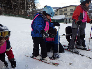 ゲレンデではまずスキー板の付け方を練習しました。片足に板をつけて滑ってみたり、カニ歩きで斜面を登ってハの字で滑ってみたり、練習を重ねていくにつれて滑る感覚に慣れてきました。「こうすると止まれるよ!」とカニ歩きのコツを他の子に教えている姿も見られました。「いつリフトに乗るの?」「早くリフトに乗りたい!」自信がついた子どもたちからはそんな声も多く聞こえましたが、リフトは明日のお楽しみ!