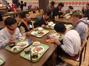 スキーが終わった後は、夕食の時間です。1日スキーをして、みんなお腹ぺこぺこ。食堂から美味しい匂いがしてきます。バイキング形式での食事も、もう3回目なので慣れて、バランスを考えて食べられる分だけ食事をとります。今日の出来事などを話しながら、楽しく夕食を食べました。