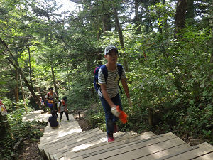登りの6号路は、自然がいっぱい!「川が流れてる!」「蜘蛛の巣あったよ!」「山の中って涼しい!」と非日常の環境にたくさんの刺激を受けていました。途中の小川では休憩しながら川遊びもすることができました。道幅が狭くでこぼこだったりと険しい道のりを乗り越え、「ここ気をつけてー!」と後ろに伝えたり、「あとちょっとだがんばろう!」と鼓舞しあう様子も見受けられました。