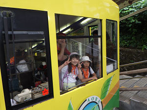 調査内容を調査隊に報告していよいよ下山。歴史的建造物の多い1号路、自然が豊富で吊り橋のある4号路、どちらにするのかを図鑑のページを参考に各々決めて下山しました。頂上では疲れ果てていた子どもたちも、お弁当チャージにより元気いっぱい。「帰り楽すぎる〜!」と呟く子もいました。ケーブルカー乗り場で各チーム合流し、日本一の急勾配にドキドキしながらケーブルカーに乗車しました。