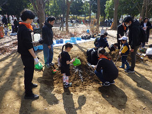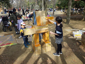 2月14日(土)に都立木場公園の南の冒険広場にて、「木場プレーパーク」を開催しました。当日は冬晴れで、昼間は暖かく、外遊びを楽しむのにちょうど良い一日となりました。天候に恵まれる中、多くの子どもたちが元気いっぱいに遊びに来てくれました。今回のプレーパークでは、木工、泥遊び、たき火、絵の具遊びの4つのコーナーを設けました。