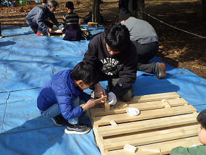 木工コーナーでは、ノコギリやトンカチを使って、子どもたちがそれぞれ思い描いたものを形にしていました。今回は特に実用的な作品が多く見られ、棚やペン立て、ミニテーブル、小物入れなど、日常生活で使えるものを作る子どもたちの姿が印象的でした。キリンやウサギといった動物を作る子もおり、中には首が回ったり腕が動いたりする工夫を凝らした作品もありました。子どもたちの創意工夫に驚かされる場面が何度もありました。