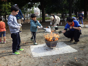 たき火コーナーでは、火の温かさを感じながら、思い思いの時間を過ごしていました。子どもたちは周りに落ちている枝や落ち葉、どんぐりを集めて火にくべ、燃える様子をじっと観察していました。パチパチと音を立てて燃える音や、立ち上る煙の匂いなど、五感を使って火を楽しんでいる様子が伝わってきました。
