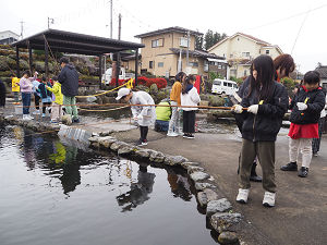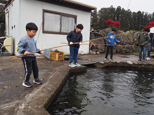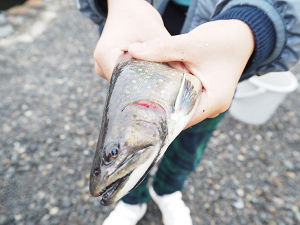 釣り針に練り餌をつけて、釣り糸を垂らしてみると、早速、大物がかかった子から「釣れたー!!」と大きな声が聞こえてきました。思っていたよりも大物のマスで、子どもたちもビックリ!子ども達にとっては、魚がかかってから引き上げて釣り針を外すところまでが難所でしたが、活きが良い魚たちと格闘しながらバケツに入れていました。