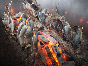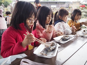 釣れたマスは、施設の方に塩焼きにしてもらいました。お腹が減っていた子ども達は、「まだかー!」と焼き上がるのが待ち切れない様子。焼き上がったマスを「うまーい!」と勢い良く食べていました。最近の子は魚を食べないという話をよく耳にしますが、子どもたちはとても上手にマスを完食していました。