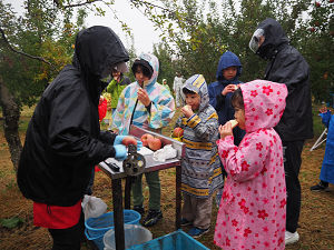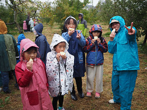 昼食のお弁当を食べた後、午前よりも雨が強くなってきましたが、午後は楽しみにしていたリンゴ狩りへ!農園の方からリンゴの採り方を教わり、早速、たくさんのリンゴがなっている果樹園に向かいました。まずは、どんな味のリンゴなのか、班ごとに採ったリンゴをカットして食べさせてもらいました。