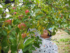 農園の方からカゴを頂き、持ち帰り用のリンゴを収穫していきます。好きなリンゴの品種がどこにあるか教えてもらったり、どのリンゴが美味しいかじっくりとリンゴとにらめっこをして選んで収穫していました。普段、スーパーに並んでいるリンゴよりも大きく、カゴに入れたリンゴの数が増えると「重いー!」と言いながらも、満面の笑みで「食べるのが楽しみ!」と話してくれました。